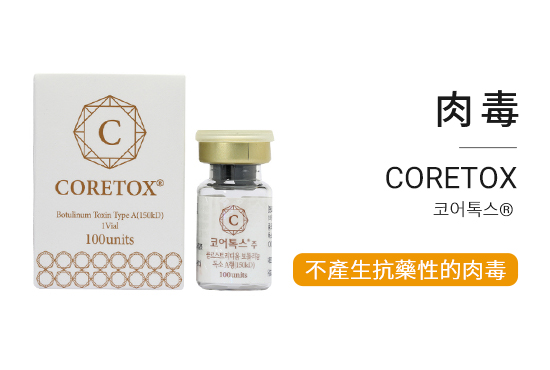 Coretox,一種低抗藥性國產毒素,減少對抗藥性的擔憂;可立即用於日常生活,簡單的注射程序,不僅能輕鬆消除皺紋,還能改善肌肉線條,有效治療過度活躍的肌肉,帶來緊緻、年輕的膚質。